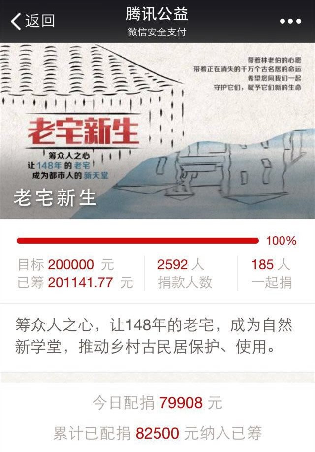 “老宅新生”项目于2015年8月7日正式上线,在过去1个月的时间里,共有2592人认筹支持了该项目,并获得腾讯公益配捐82500元,让我们的首次公益众筹获得成功。