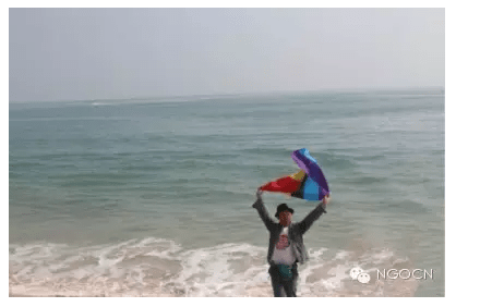 刘九龙在海滩举起象征同志权益的彩虹旗