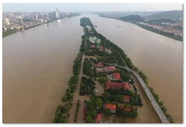 ▲长沙橘子洲景区遭洪水“穿洲”