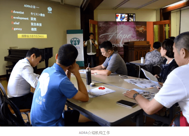 ADRA成立于1985年,2004年取得特定非营利NPO法人资格,是一家致力于国际救援的NPO组织,曾参与阪神大地震、东日本大地震救援和灾害重建工作,主要业务内容为救灾、紧急援助以及灾后重建与复兴。在灾后重建与复兴中注重儿童及儿童家长教育、卫生健康和生计支援。ADRA在灾后帮助当地的人们建立临时厕所,教授洗手的姿势,普及健康知识等,预防灾难之后细菌的传播与感染;在救援中还深度关注灾民的心理健康问题,对灾民的心理进行干预恢复。