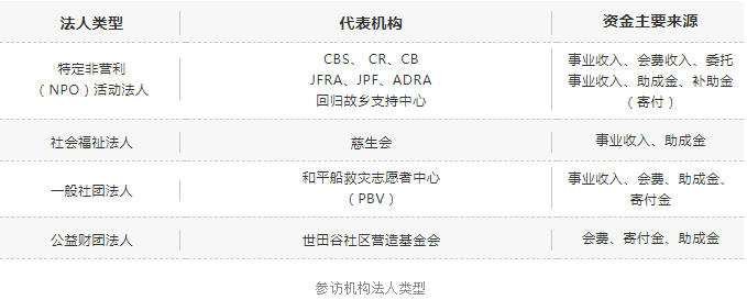 因此,基于日本的法人制度,笔者对参观的10家机构的法人类型及资金来源一目了然,详见下表。在日本NPO管理体制下,助成金为捐赠或资助的意思,种类包含了政府的助成金和大企业的助成金,寄付的为国内的捐赠,一般包括居民个人捐赠和小企业捐赠。会费为会员定期支付的资金,事业收入为NPO组织开展经营性活动所获得的商品或服务的合法收益,这是与国内社会组织在管理上面的一个较大差异。