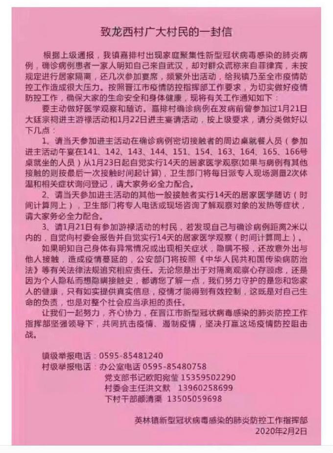 2020年1月20日武汉封城前,泉州晋江一家四口从武汉返乡后,未及时进行自主隔离,并参加千人大型聚会、宴席,致使当地疫情迅速扩散,出现“一人感染全村隔离”的现象,覆盖了晋江11个乡镇街道,超过90个村庄,近4000人因此医学观察。