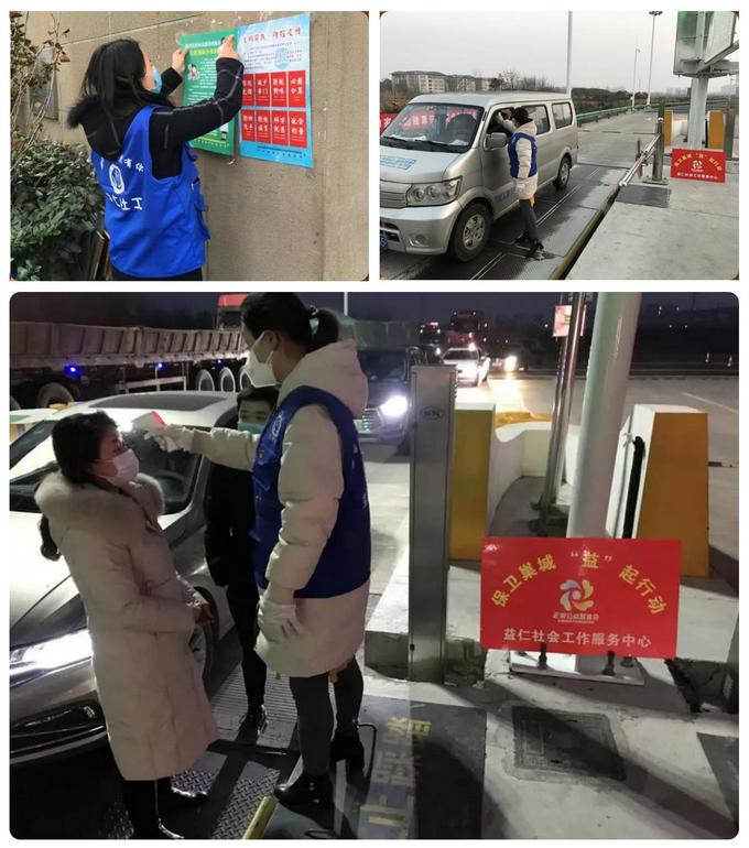 安徽省巢湖市境内有半汤和柘皋两个高速出入口,巢湖市益仁社工志愿者在2处高速公路路口为进入巢湖城区的车辆人员进行体温检测,如发现发烧人员及时向上级部门汇报。