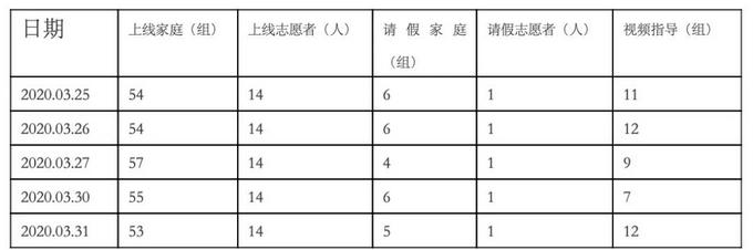 03.25-03.31,“公益半小时”共服务273组次家庭,志愿者共计136.5小时服务时长。平均每日服务54.6组次家庭,平均每名志愿者每天服务1.95小时。