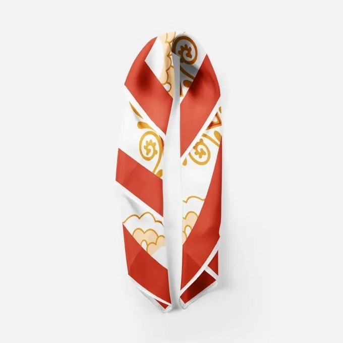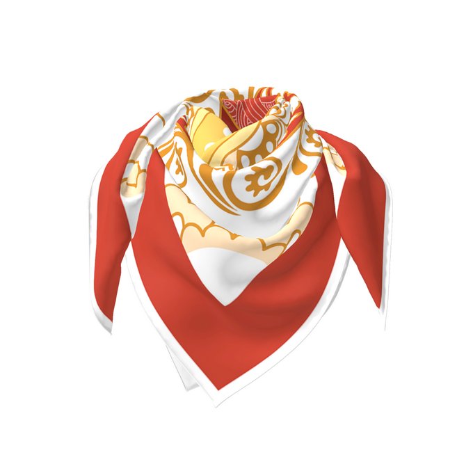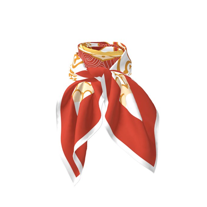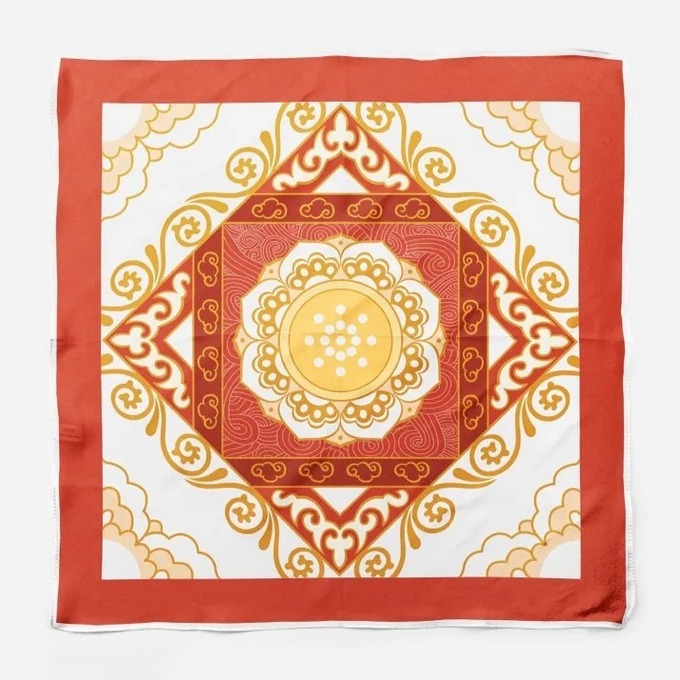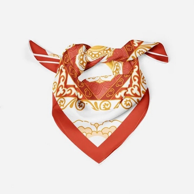 一方小小的丝巾,包罗太阳、祥云与莲。莲与云拥抱,融入如霞光般的暖色,是从心底升腾而起,对生命与本心的热望。