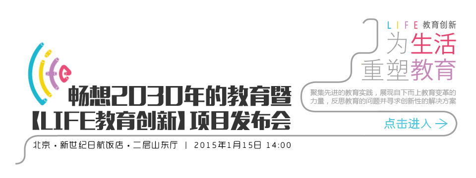 届时将发布LIFE教育创新项目及“畅想2030年的教育调查问卷”的结果,更有杨东平(21世纪教育研究院院长,国家教育咨询委员会)、伏彩瑞(21世纪教育研究院理事,沪江网创始人)、夏青峰(北京中学校长)和李华(IT外企员工,家长代表)共同对话,剖析未来教育的方向,反思现在教育的问题,探讨教育如何从现在走向未来。