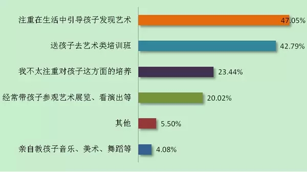 76.6%对孩子艺术修养有不同程度重视的家长采取过哪些行动?近半数受访者表示其“注重在生活中引导孩子发现艺术”(47.05%),“送孩子去艺术类培训班”的家长占42.79%。此外,“经常带孩子参观艺术展览、看演出”的家长占20.02%,有4.08%家长亲自上阵“教孩子音乐、美术、舞蹈等”。可见,送孩子去培训班仍然是家长的重要选择之一,极少数家长可亲自对孩子进行专业的艺术指导。