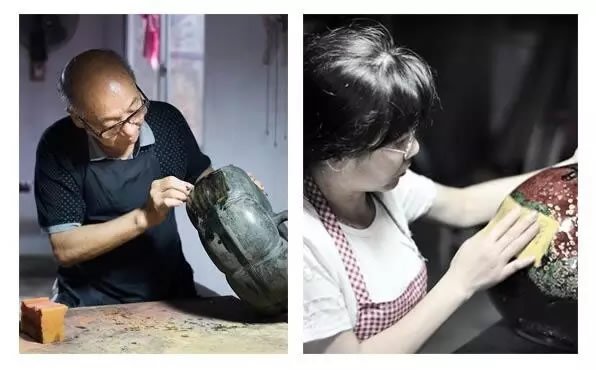 漆器的制作工序包括打底子、刮面漆、磨砂皮,连续多次上漆、入阴房、阴干、擦漆、再上漆、打磨等,经过25道工序,与其说大漆是繁琐的工艺,不如说是一种用时间等待的艺术。