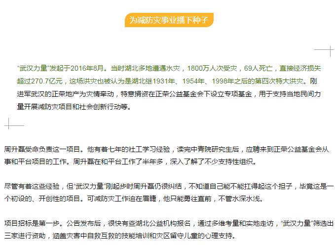 武汉力量,是由正荣地产捐资在正荣公益基金会设立的专项公益项目。该项目面向武汉及湖北区域,通过“创新、有效、灵活”的资助模式,支持在地民间公益组织开展灾害服务项目、社会创新行动等,以聚合多方力量,助力当地的公益行业发展和社会建设。
