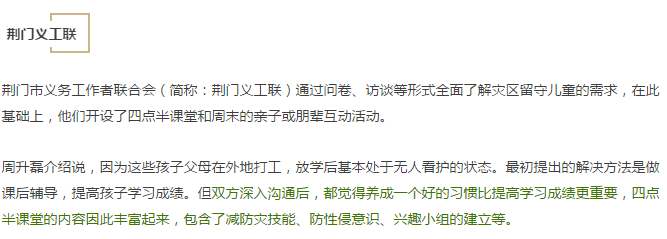 周升磊补充说,“如果在全省范围内比较,湖北公益要看武汉,武汉公益要看武昌,因为武昌被政府选为公益创新的试点去推动。”