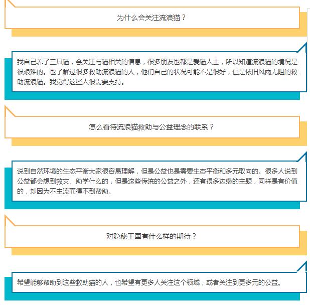开展一些面向公众参与的线下沙龙活动,让更多人了解到流浪猫的现状,也传递科学养宠的知识,并尝试为公益人提供工作坊。