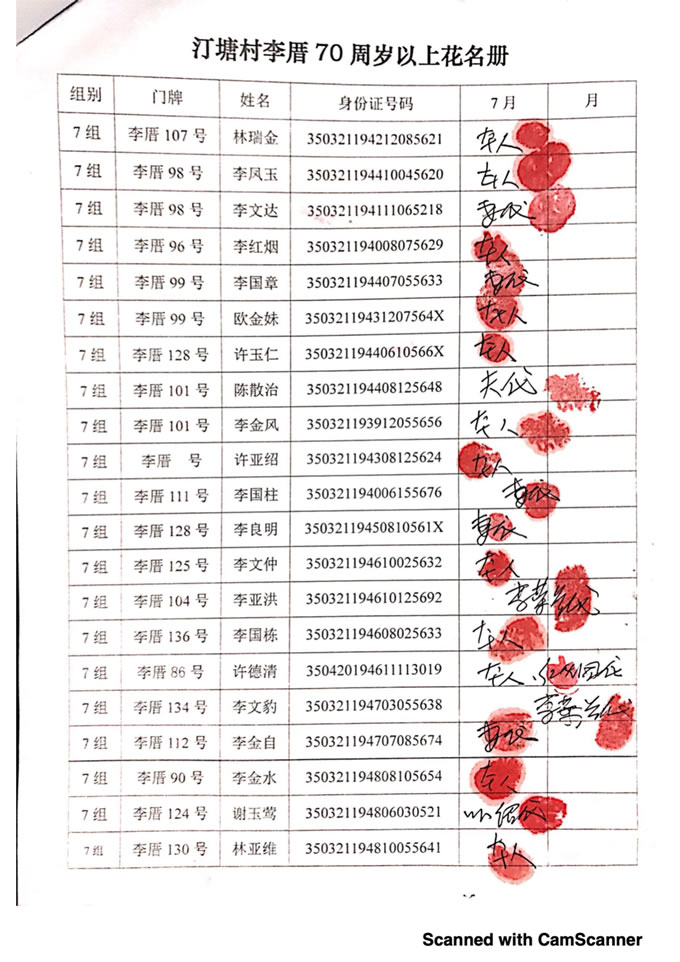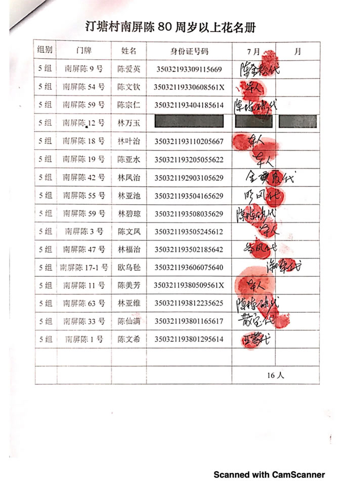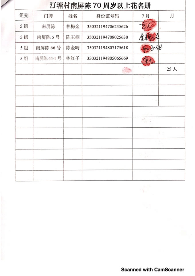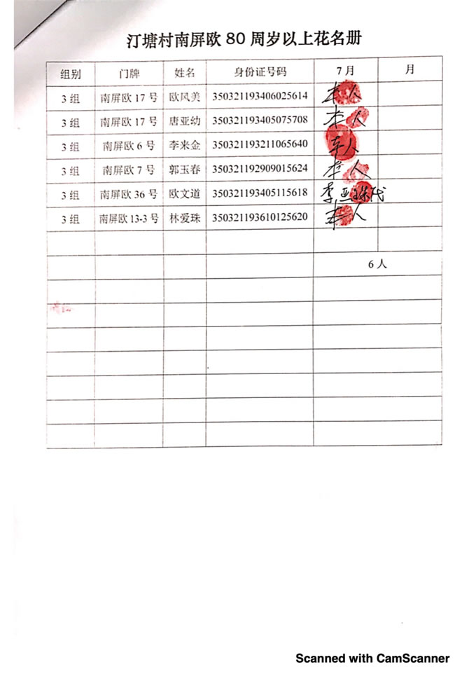 2018年7月,项目为汀塘村70周岁以上的老人发放400-1000元不等礼金(70-79岁老人,一个月400元;80-89岁老人,一个月600元;90-99岁老人,一个月700元;100岁及以上,一个月1000元。)