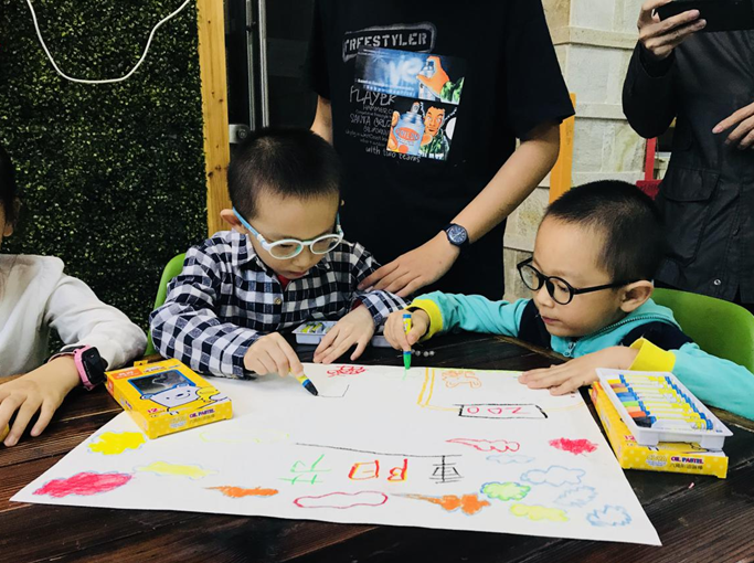 在社区的妈妈们协助小志愿者切水果准备的间隙,大家一起把活动招牌画好了。