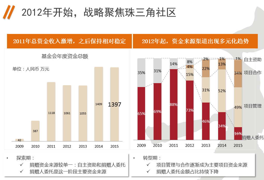 第一,项目管理做了一个重要推进,完善基金会项目管理流程,但发展的过程当中另外一个问题出现了,所以第二是捐赠和捐赠人管理,以往资金来源多是政府采购服务,但这个不是长久之际,意味着必须把筹资拉到一个很重要的工作去做。