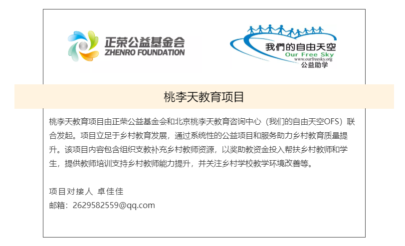 2018年,正荣集团联合正荣公益基金会、我们的自由天空OFS共同发起“桃李有梦·荣遇未来 ”公益项目,号召正荣员工及社会爱心人士奉献爱心,设立专项公益资金,通过提供奖助学金、教师培训、学生夏令营等支持,形成一套完整的助学体系,助力乡村教育质量提升。