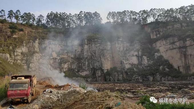 2019年4月10日下午4点14分,环境守护者于福建三宝钢铁有限公司附近【经纬度: g117.614329,24.635159(GCJ02坐标)K码: 8buib5gzh】发现一处约33亩的石材矿开采坑。坑里填埋了大量的垃圾,部分方位垃圾还在燃烧。据附近一位村民表示这里三年前还有开采石材,这个坑非常深,卡车会经常将垃圾运往这里倾倒。