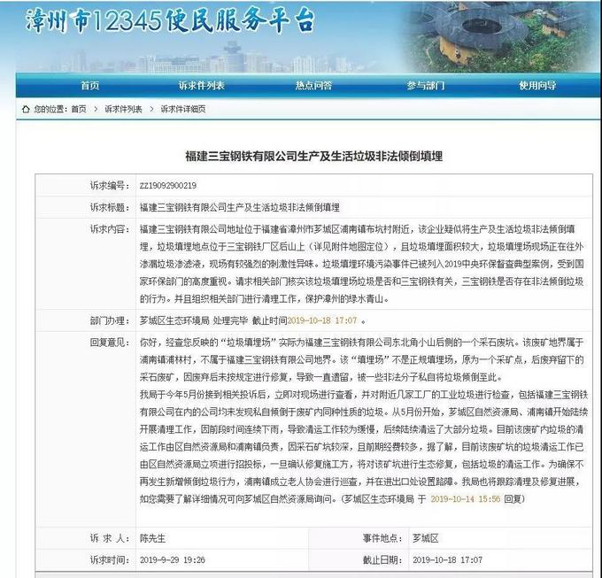 我局于今年5月份接到相关投诉后,立即对现场进行查看,并对附近几家工厂的工业垃圾进行检查,包括福建三宝钢铁有限公司在内的公司均未发现私自倾倒于废矿内同种性质的垃圾。从5月份开始,芗城区自然资源局、浦南镇开始陆续开展清理工作,因前段时间连续下雨,导致清运工作较为缓慢,后续陆续清运了大部分垃圾。