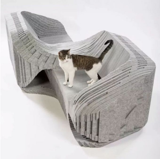这个看起来层层叠叠的猫窝由Formation Association、Arktura 和BuroHappold三家公司共同合作设计而成。设计灵感来源于岩石,但事实上这个猫窝的材质是可再生塑料,质感更加偏向毛毡。和岩石的冰冷坚硬不同,这种材料制作的猫窝更加的温馨,内里还有贯通猫窝内部的S型通道可供猫咪自由活动。