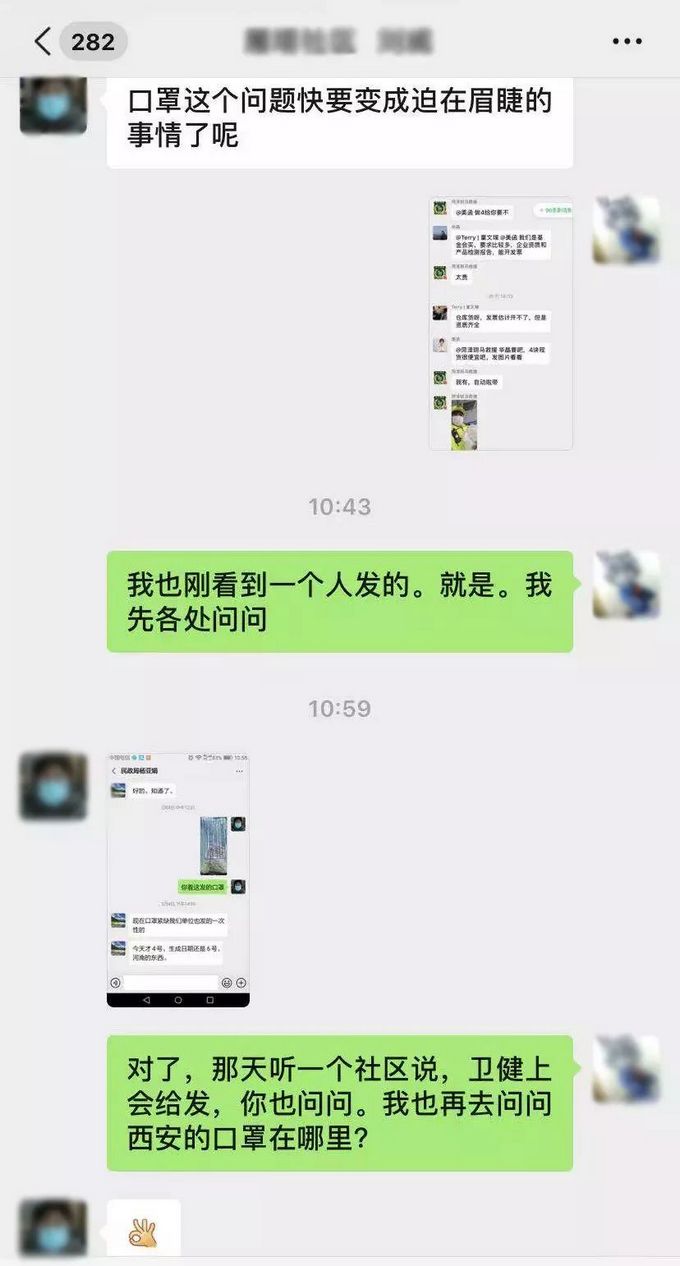 处处想办法解决值班人员和环卫人员的口罩,找街办、找朋友、网上找厂家,随时也发社区的需求及时反馈出来,与陕西众益一起寻求解决方案。