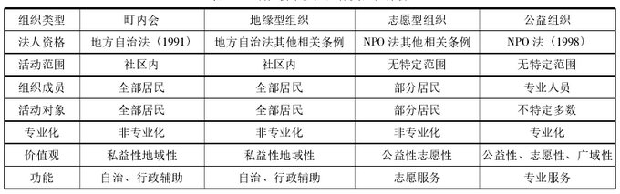 在日本,有统合性的町内会、地缘型组织、志愿型组织以及提供专业服务的公益组织秉持不同的价值观在特定范围内组织成员开展活动,参与公共事件并发挥积极作用。