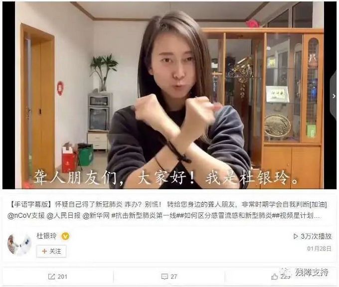韩青的残障义工网络组杜银玲录制的手语防疫视频
