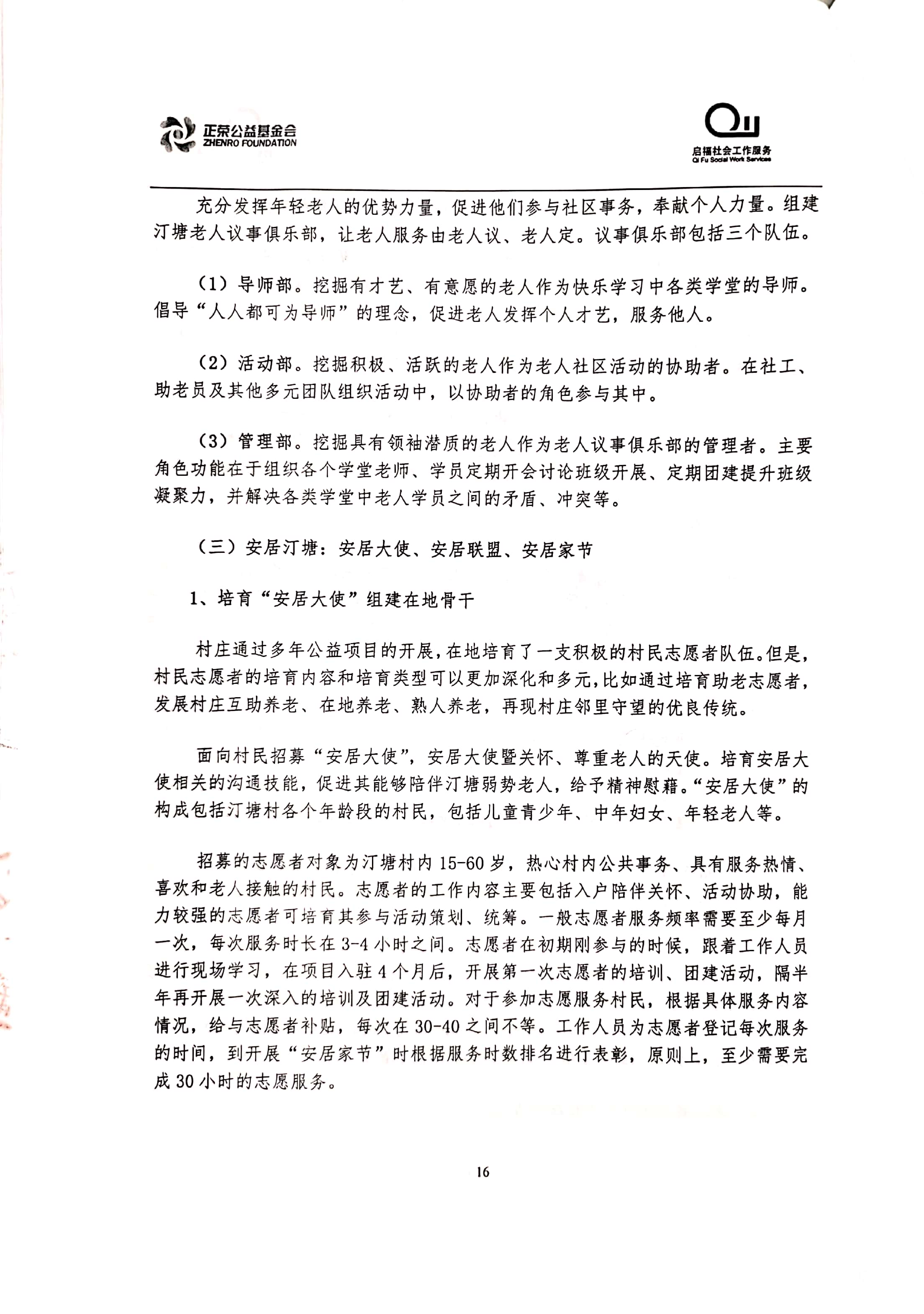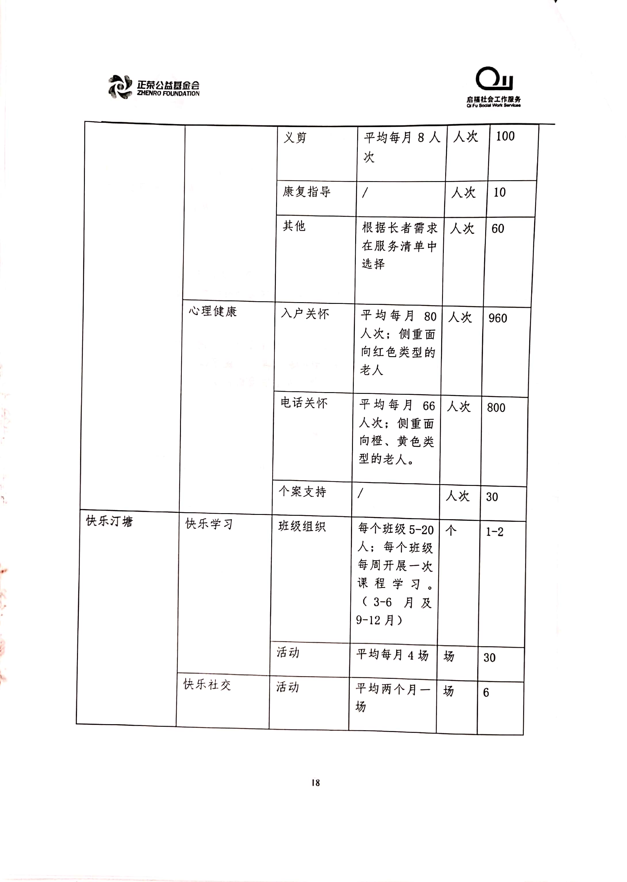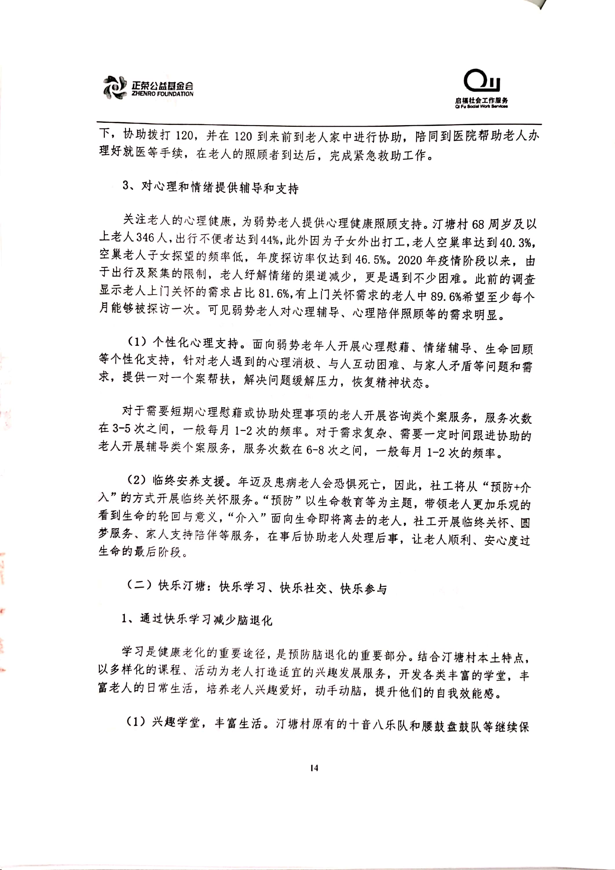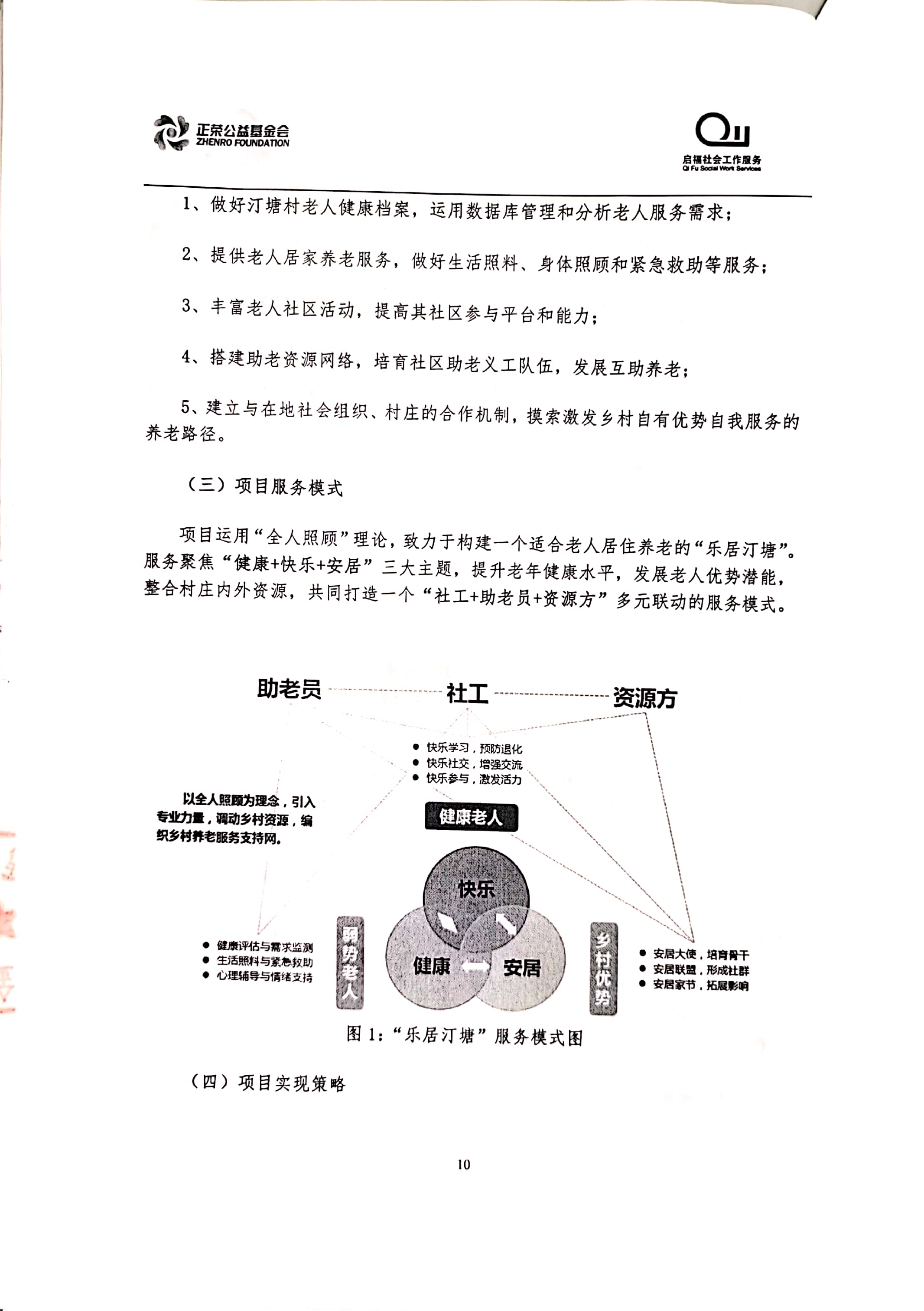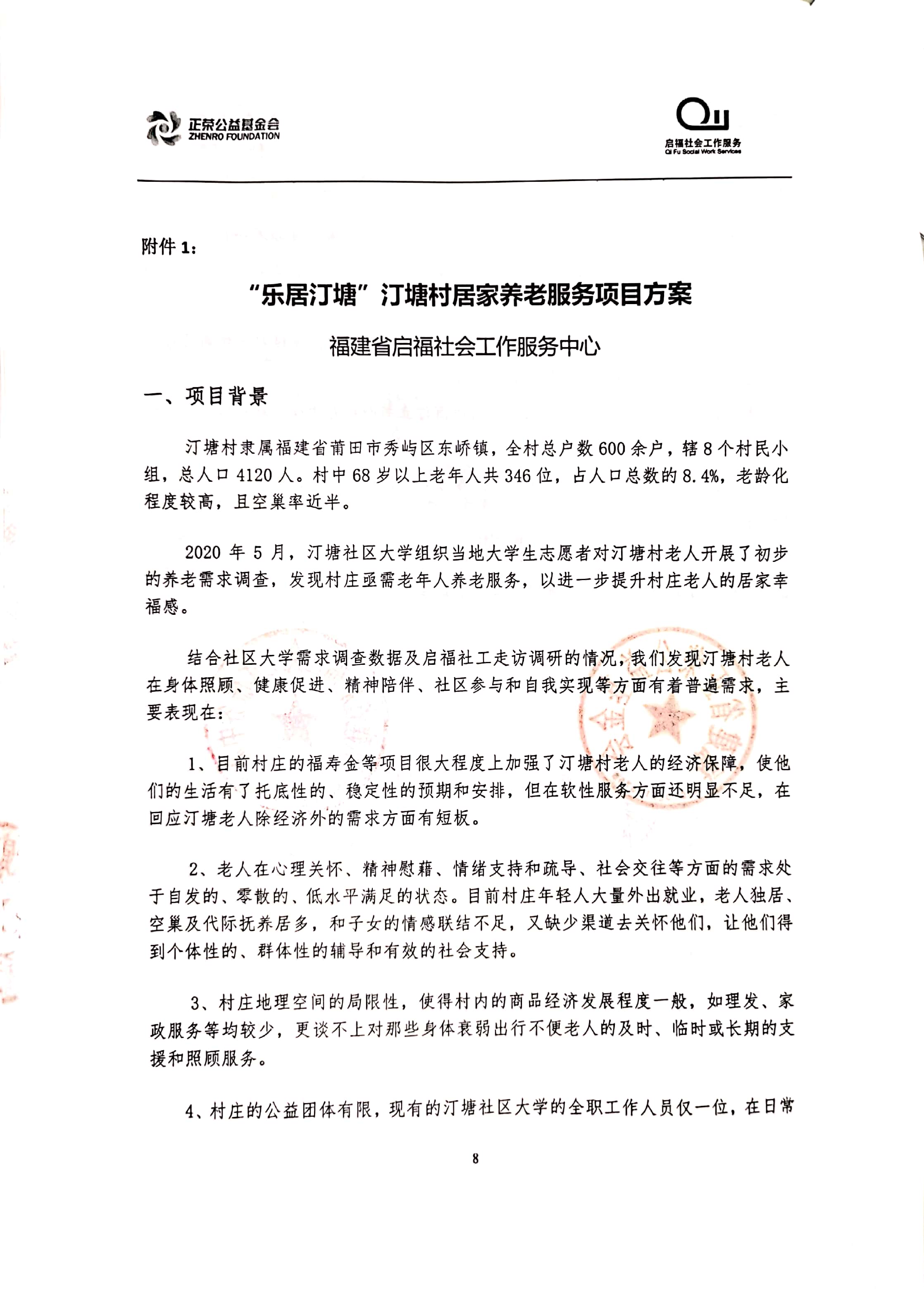 “乐居汀塘”汀塘村居家养老服务项目由林越集团、正荣集团、正荣公益基金会于2020年联合发起,委托福建省启福社会工作服务中心具体执行。项目计划围绕汀塘村老年人的身、心、社、灵全人健康维度,透过专业化服务手法整合辖区多方资源,回应老人日益增长的多元化养老需求,提升老人居家养老幸福感,打造“健康、快乐、安居”的汀塘。立项合作协议及项目方案如下:
