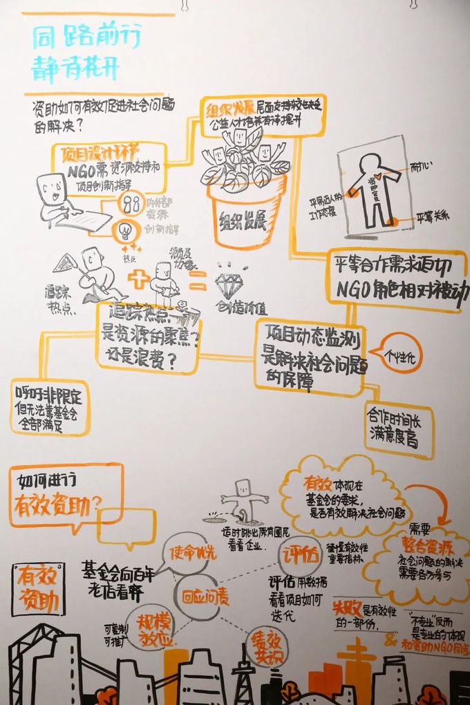 一方面,NGO若想持续发展,除必要的项目经费外,还需要多方面资源的配合支持。基金会的介入可以引导NGO发现并利用可供统筹使用的非资金资源,有助于项目的创新和迭代。另一方面,NGO的优势在于能及时观察到一线社会问题的动态,而弱势则是很多NGO在项目设计上经验不足,缺乏创新意识和设计思维,需要基金会提供项目创新的方法和指导。相较于项目结项时的反思总结,基金会在项目设计环节的引导更能让NGO防患于未然,以终为始,为后续项目执行制定正确的“航向”。