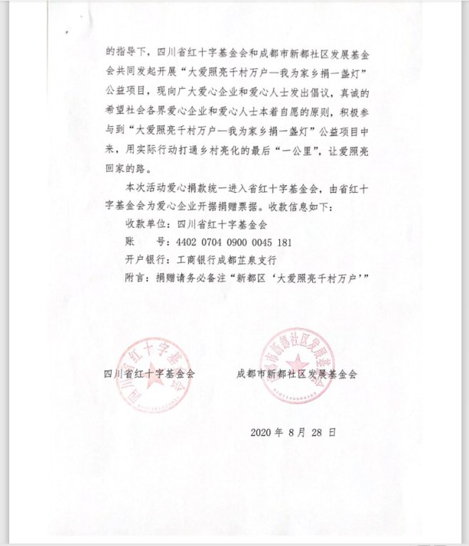 为了顺应广大老百姓们对美好生活的期待,全面落实乡村振兴战略,切实改善和优化群众的活动场所,更加方便老百姓安全出行。在新都区委社治委的指导下,新都社区发展基金会与四川省红十字基金会共同发起开展“大爱照亮千村万户——我为家乡捐一盏灯”公益项目。用实际行动打通乡村亮化的最后“一公里”,让爱照亮回家的路。