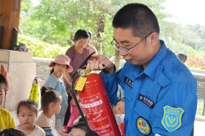 林晓亮老师讲解完家里的防火知识,给小朋友们介绍了灭火器。