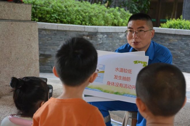 老师告诉小朋友们,一旦发现有人落水,小朋友应该及时呼救、打电话等寻求他人力量,不该贸然自己救人。