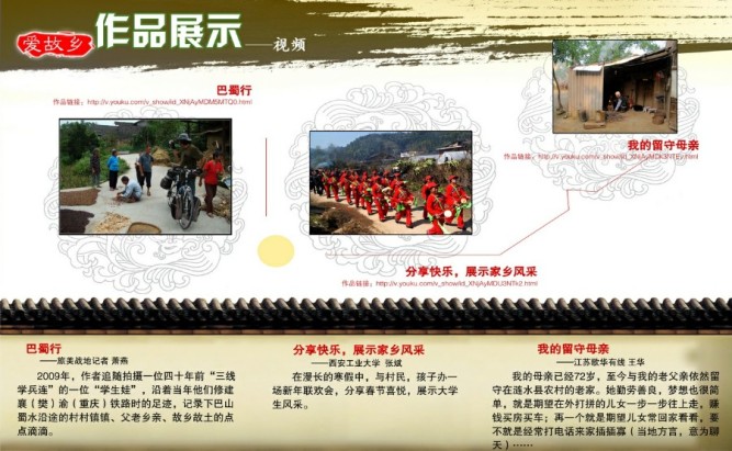 4、2013爱故乡公益活动获奖作品欣赏:http://v.youku.com/v_show/id_XNjUyMDQzMDIw.html