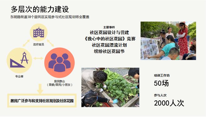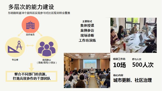 街道干部,尤其是街道党政一把手的参与,这在当下中国是非常重要一种机制。刘悦来他们构建了从政府工作者到专业者,再往下到社区、居委干部以及包括儿童在内的普通居民的相关培训,让大家通过一种协商的工作坊机制形成共识。