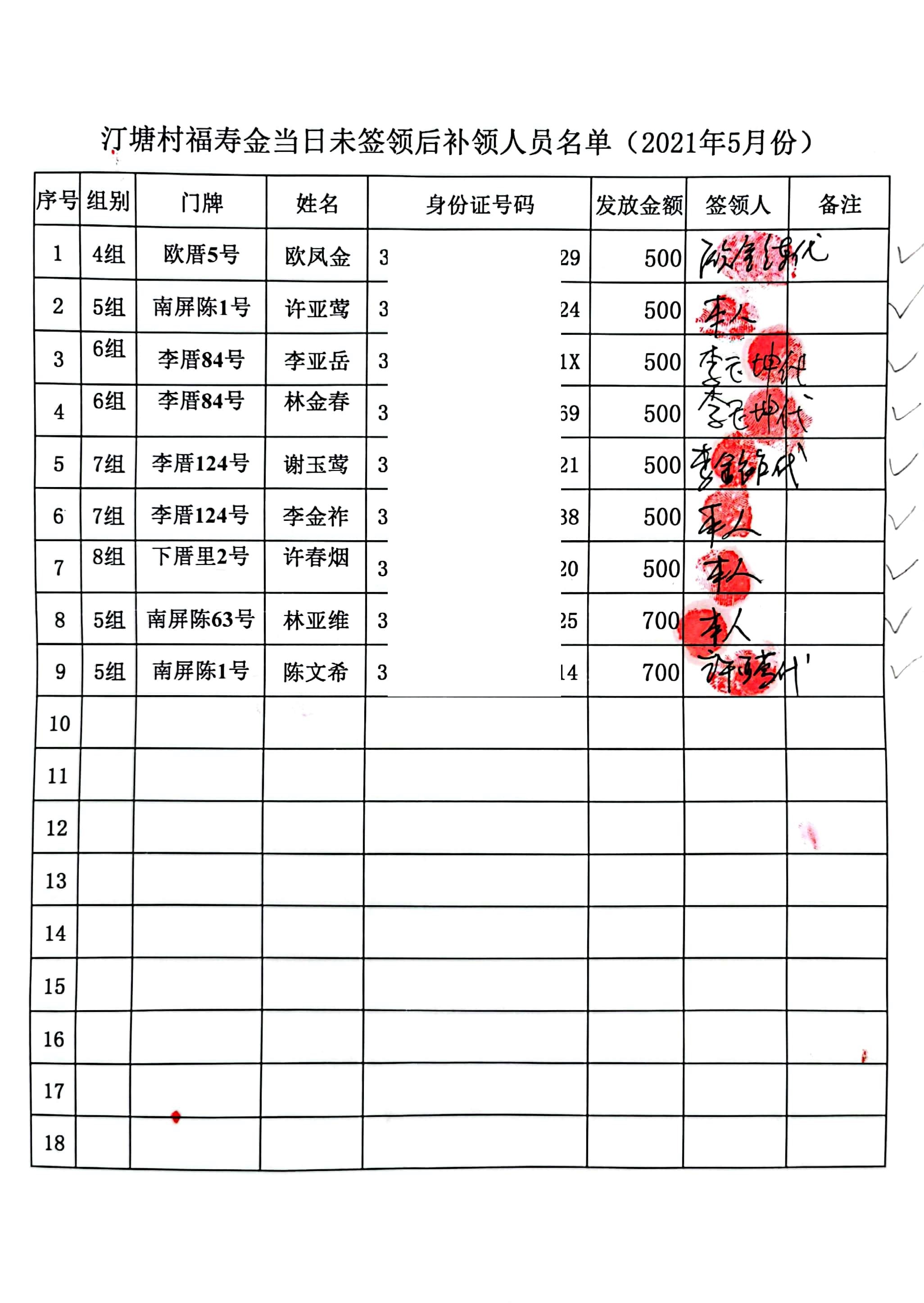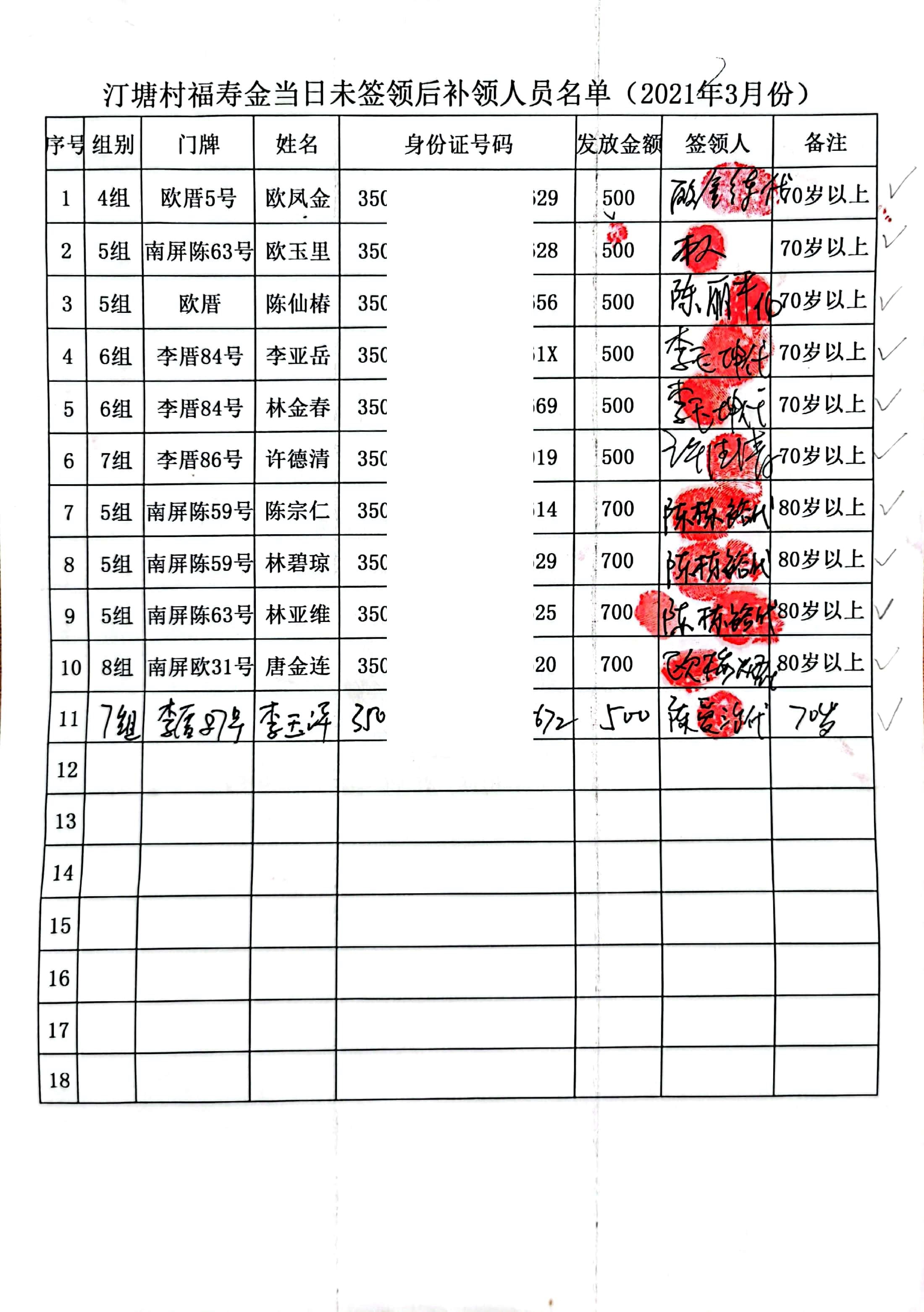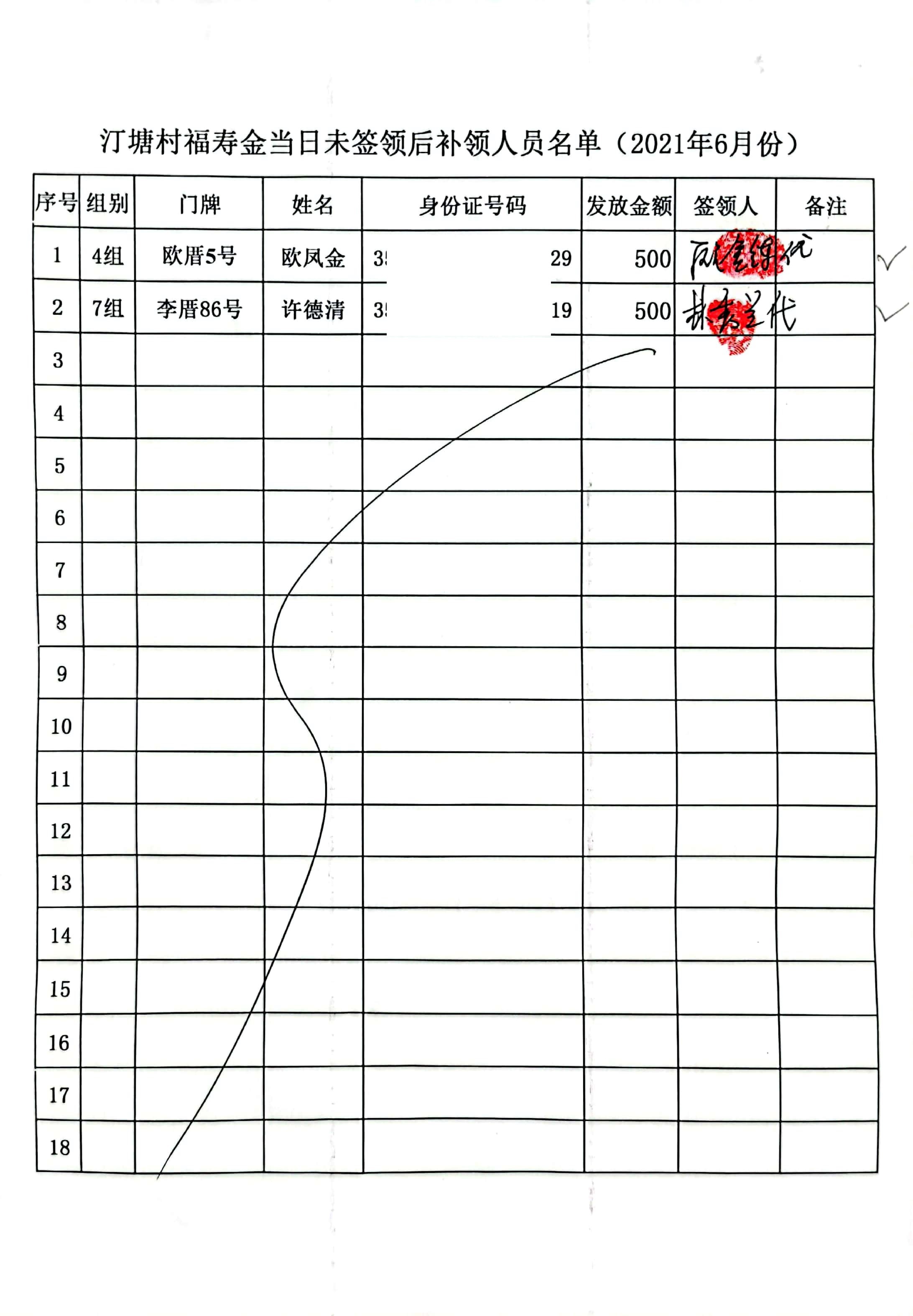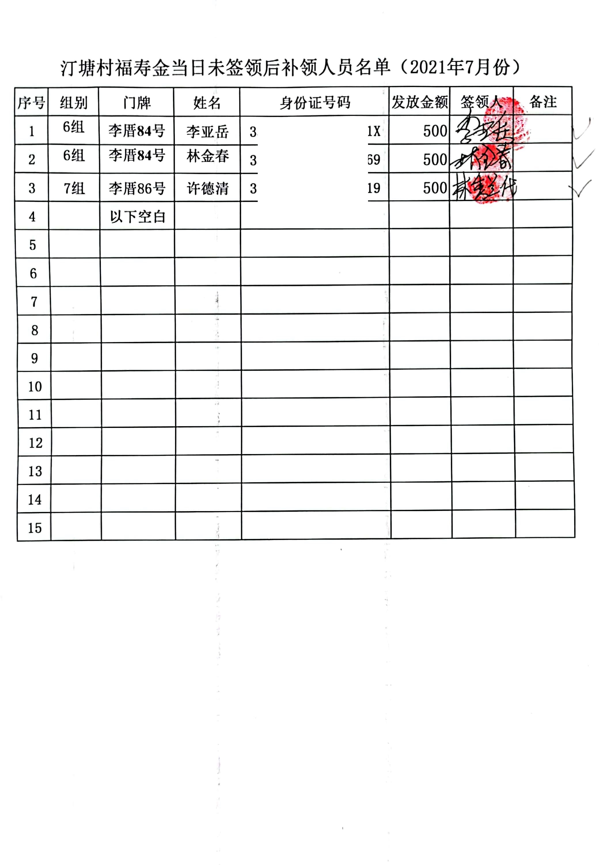 【汀塘福寿金】补领发放公示(2021年1月-12月)