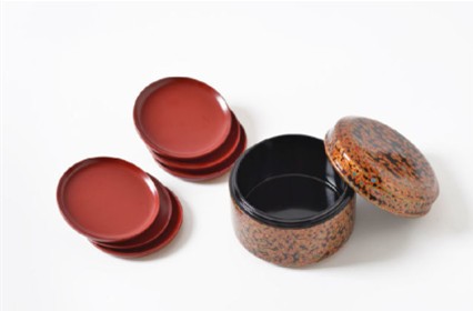 (用另一种彰髹技法制作的大漆茶海,层层髹刷不同颜色的漆后,研磨出霞光、云彩等纹样)