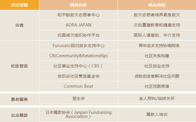 9月8-14日,游学团共参访了Furusato回归故乡支持中心、和平船救灾志愿者中心、慈生会、社区事业支持中心等10家东京NPO,关注议题包括灾害救援、养老服务、社区营造、公众筹款四个议题,在每个议题之下各机构关注具体内容却有明显的差异,服务更为精细和具体,详见下表。