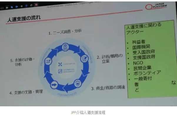 JPF是日本抗震减灾组织的枢纽组织,成立于2000年的特定NPO法人,代表日本政府进行国际人道主义援助,曾参与汶川大地震、雅安大地震的灾害救援工作。JPF连接了包括NPO、企业和政府部门在内的重要合作伙伴,之前参访的PBV、ADRA组织都是JPF联盟中的成员,目前支持43个非政府组织的灾害援助活动,向47个国家和地区提供了1200个项目的人道主义援助,总的财政贡献为400亿日元。