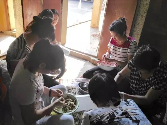 老伯指了指厨房的方向,说“她们在那边煮,我们在这边晒。”