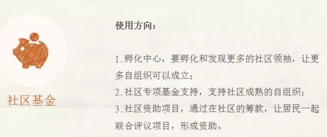 项目还设立了社区发展基金,目前挂靠在一个公募的基金会,得到了社区、爱心商家、网民等捐款。社区发展基金用于社区骨干培养以及社区自组织培育,主要使用方向如下: