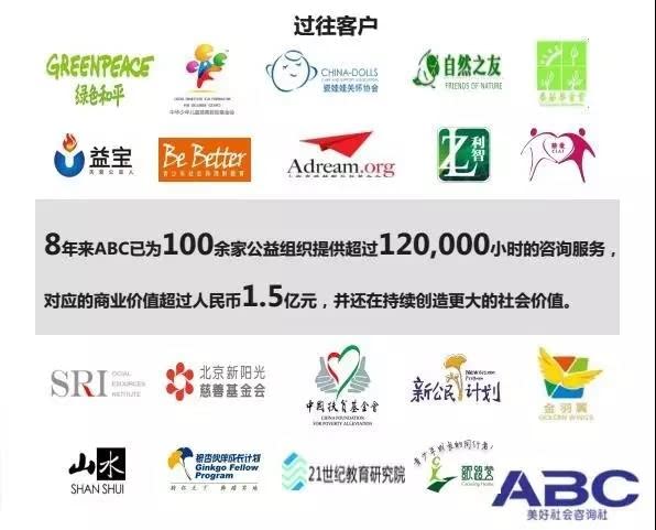 美好社会咨询社(简称ABC)服务于中国境内的非政府组织(NGO), 通过整合职业人士和高校师生的优势资源,帮助NGO解决因缺少专业知识与技能而无法完成的具有调研和分析性质的工作,从而促进NGO持续、有效和健康的成长。