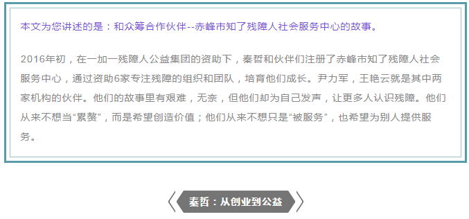 秦哲介绍说,自从结识一加一后,在他们的帮助下,2015年他们多次出去学习残障公益知识,并参加了2015残障领袖训练营,对残障有了新的认知,回来后,承接了正荣微公益项目,并得到了和平台的项目资助。