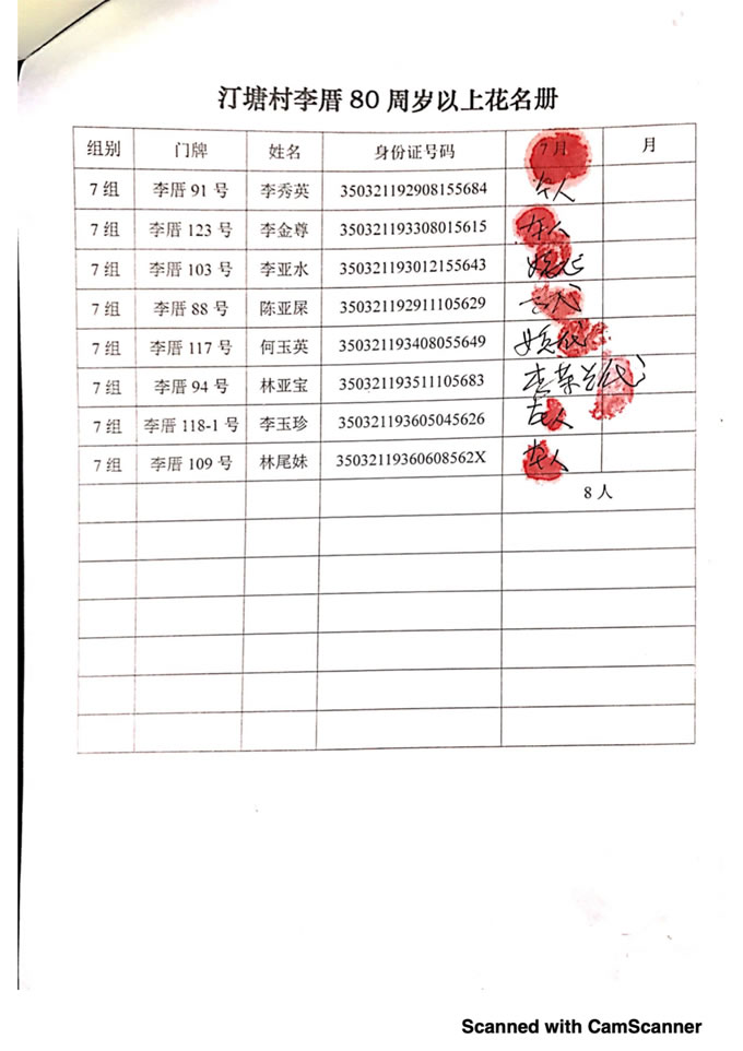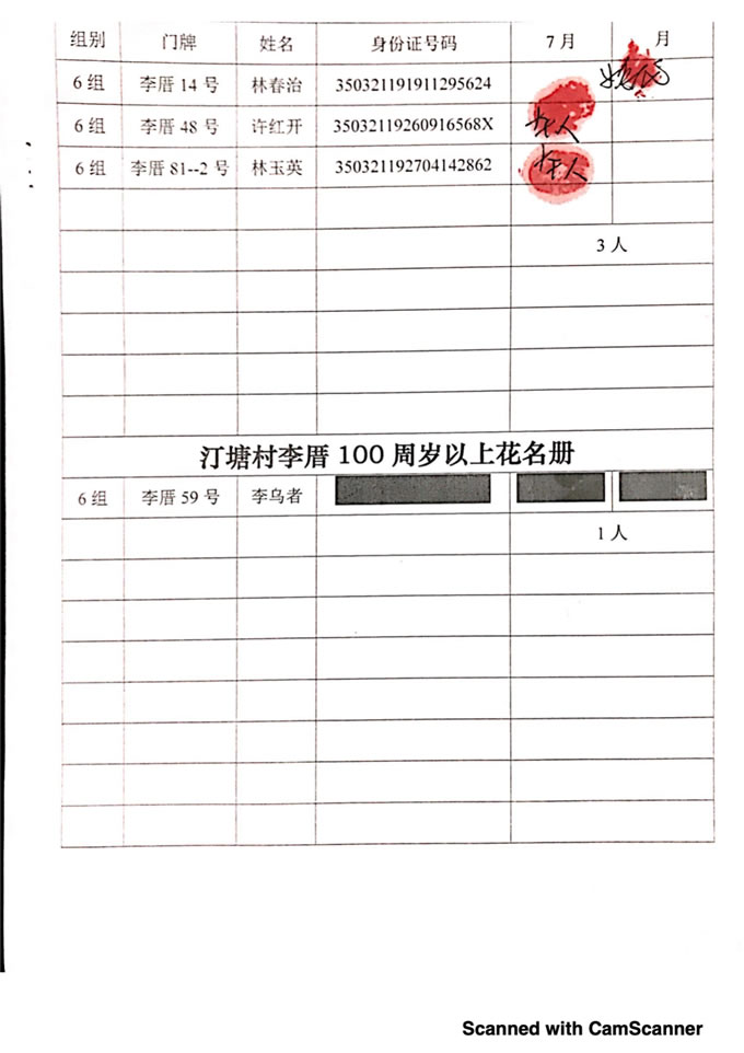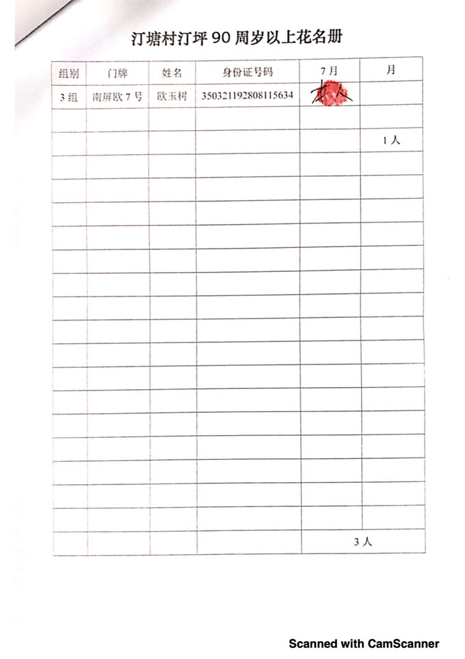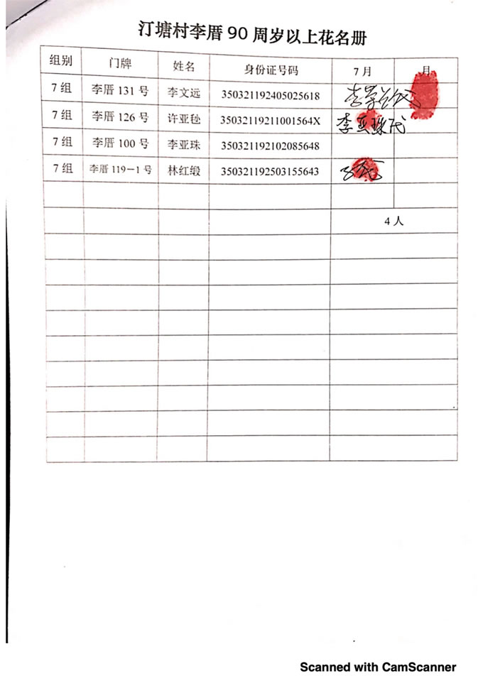 2018年7月,项目为汀塘村70周岁以上的老人发放400-1000元不等礼金(70-79岁老人,一个月400元;80-89岁老人,一个月600元;90-99岁老人,一个月700元;100岁及以上,一个月1000元。)