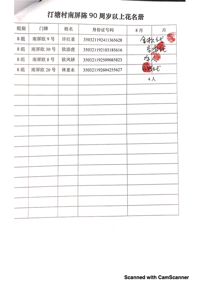 2018年8月,项目为汀塘村70周岁以上的老人发放400-1000元不等礼金(70-79岁老人,一个月400元;80-89岁老人,一个月600元;90-99岁老人,一个月700元;100岁及以上,一个月1000元。)