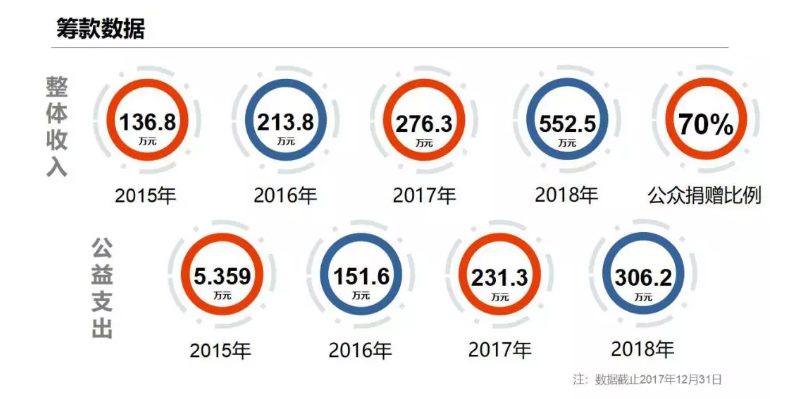 下面看一下我们的收支结构,整个公众捐赠的收入占总收入的比例大概70%左右,到2018年我们的支出是306万。