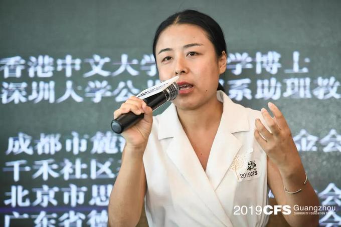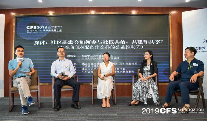 圆桌论坛环节中,广东省千禾社区公益基金会秘书长王书文、成都市麓湖社区发展基金会(筹)副秘书长梁艳、广东省德胜社区慈善基金会理事兼秘书长曾丽、北京市思诚社区公益基金会秘书长王衍臻和广州社会组织研究院特聘研究员赖伟军一起探讨了三个问题。