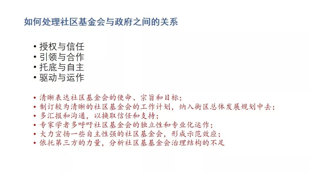 一方面就是社区基金会是要有高度的主体性的,内部的治理结构是比较完备的,比较健康的;另一方面就是整个街区的治理的主体之间的关系是比较顺的,大家是平等主体之间的关系,实现相互的互补,利益的共享。