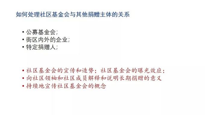 第三个,就是要积极的传播社区的公益文化。如果社区公益文化没有建立起来,即便是有一定的收入水平,人家也未必会为你的基金会捐赠;还有密切的去联系社区中的一些达人,能人,好人(就是公益慈善有钱的人)给我们捐赠,以及有需求的人。这个就是通过社区基金会,把这些不同的人全部融入到这个平台,实现一个相互对接。当然,社区基金会现在只是一个组织,这个组织要在社区中形成认同,是希望开展一系列活动的,所以要定期去举办、资助社区的各种活动,也要有显示度,通过不断活动之中,让居民们来形成对社区基金会的认知。