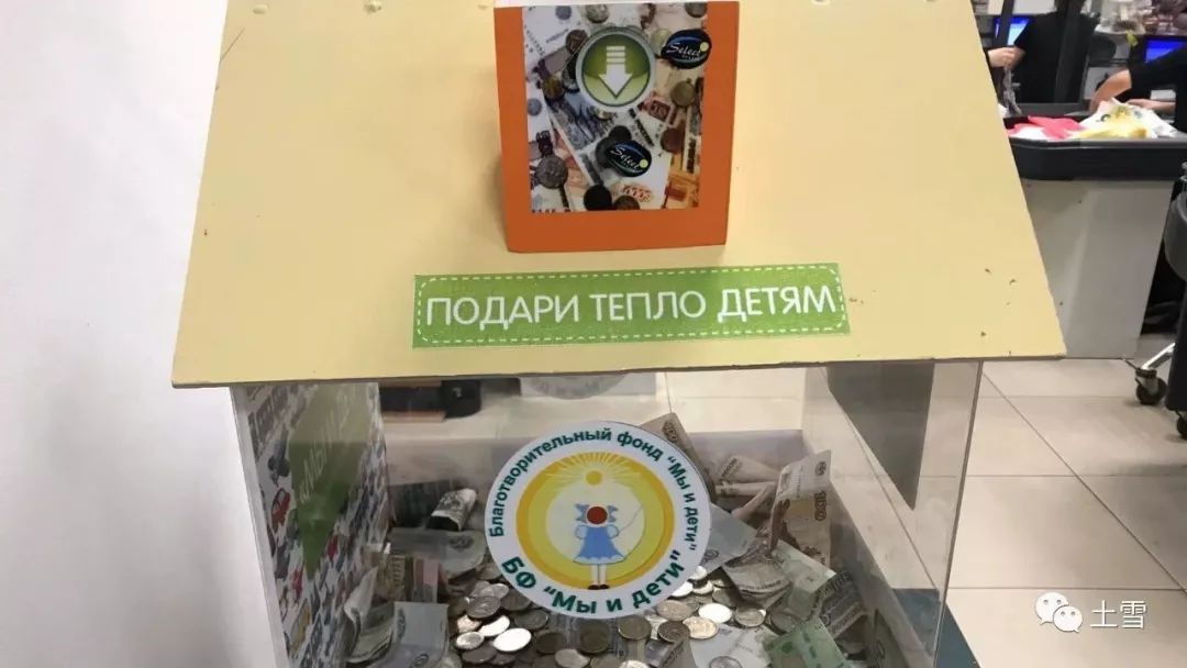 海参崴超市出入口有多家公益组织的募捐箱