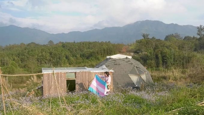 喜公益发起人刘培麟正式搬家到家园计划共识社区,图片是作为跨性别女性的刘培麟,挥舞跨性别旗帜。(摄影/Sisu)