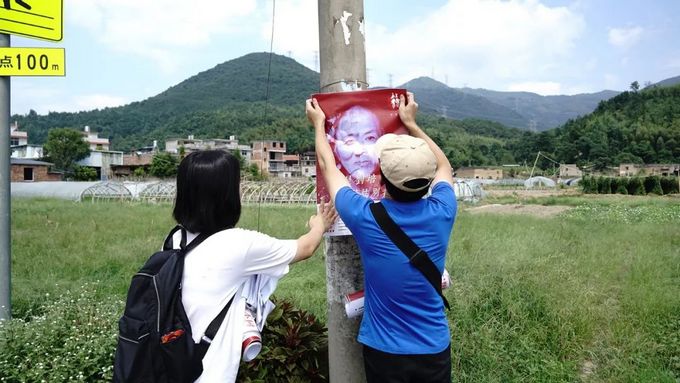 乡村地区对多元性别的认知极为匮乏,喜公益志愿者开始张贴大量反歧视海报,为村民普及反歧视概念、讲解多元性别知识。海报主题是喜公益发起人刘培麟的肖像。(摄影/志愿者)