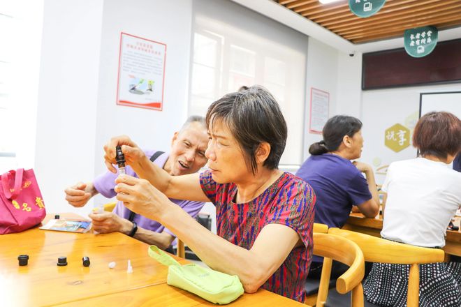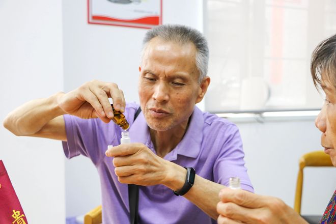 社区居民都积极参与,长者食堂里一派热闹的景象,空间中也弥漫着精油的芳香气息。在相互交流和探讨中,很快,一支支驱蚊油诞生了。居民们的脸上满是喜悦的笑容。